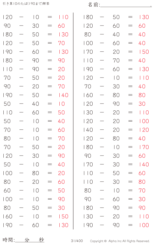 上記のボタンから「引き算10のたば(190まで)」の算数数学ドリル・計算ドリル(PDFプリント)がダウンロードできます。個人利用は無料です(家庭以外での配布は有料です)。