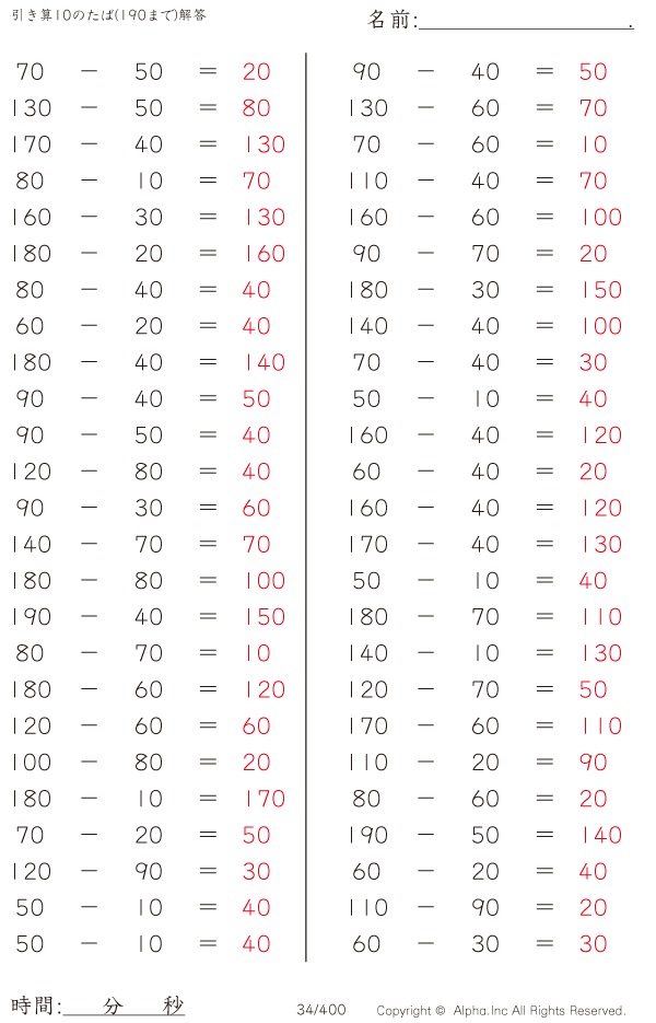 引き算10のたば(190まで) [解答]034/400