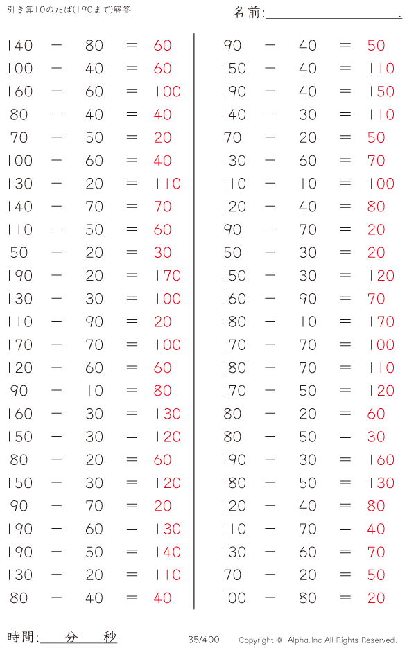 上記のボタンから「引き算10のたば(190まで)」の算数数学ドリル・計算ドリル(PDFプリント)がダウンロードできます。個人利用は無料です(家庭以外での配布は有料です)。