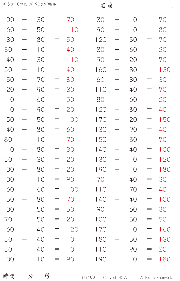引き算10のたば(190まで) [解答]044/400