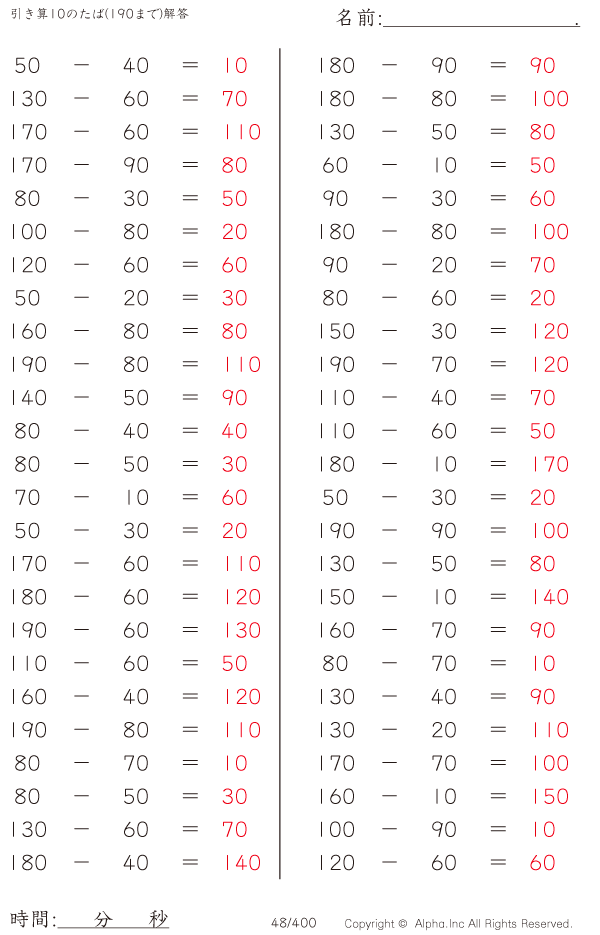 上記のボタンから「引き算10のたば(190まで)」の算数数学ドリル・計算ドリル(PDFプリント)がダウンロードできます。個人利用は無料です(家庭以外での配布は有料です)。
