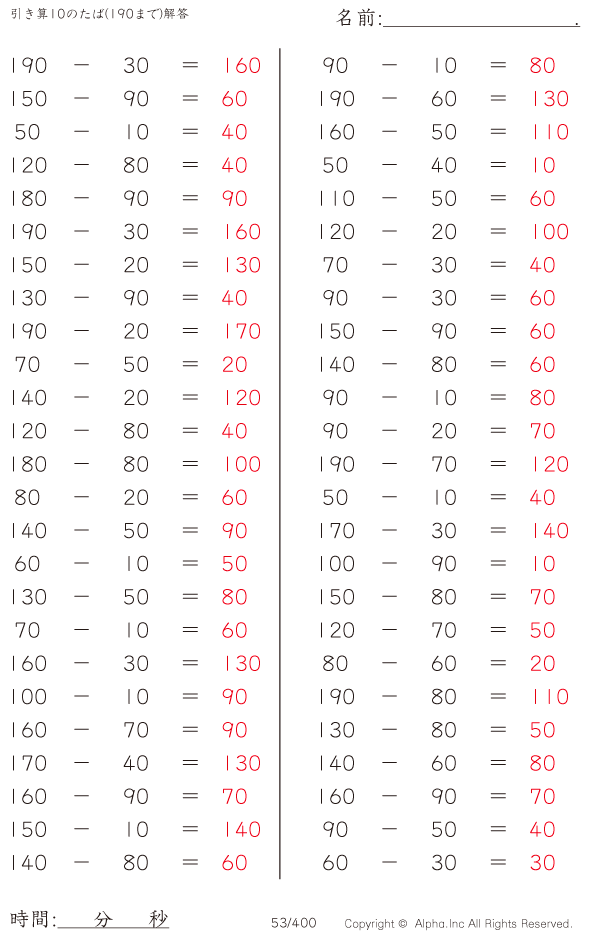 上記のボタンから「引き算10のたば(190まで)」の算数数学ドリル・計算ドリル(PDFプリント)がダウンロードできます。個人利用は無料です(家庭以外での配布は有料です)。