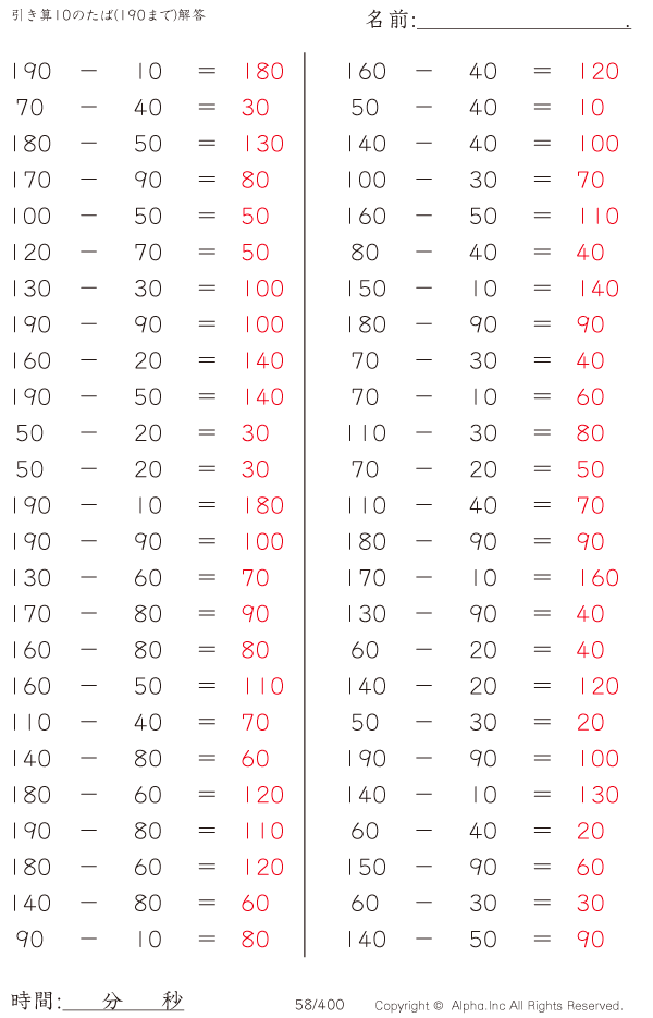 引き算10のたば(190まで) [解答]058/400