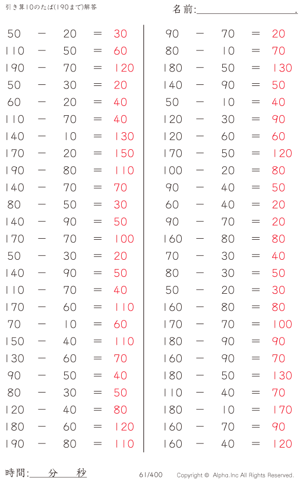 上記のボタンから「引き算10のたば(190まで)」の算数数学ドリル・計算ドリル(PDFプリント)がダウンロードできます。個人利用は無料です(家庭以外での配布は有料です)。