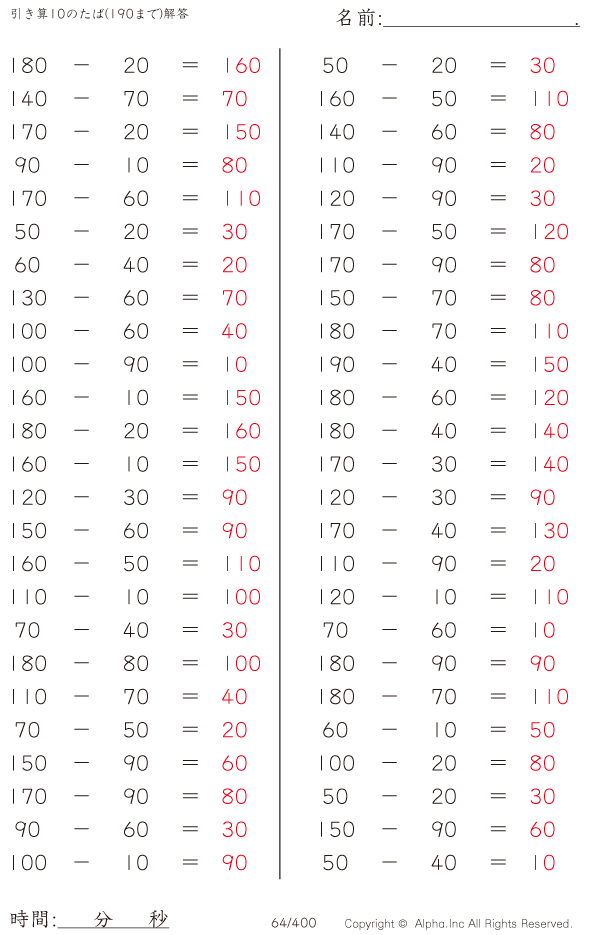 上記のボタンから「引き算10のたば(190まで)」の算数数学ドリル・計算ドリル(PDFプリント)がダウンロードできます。個人利用は無料です(家庭以外での配布は有料です)。