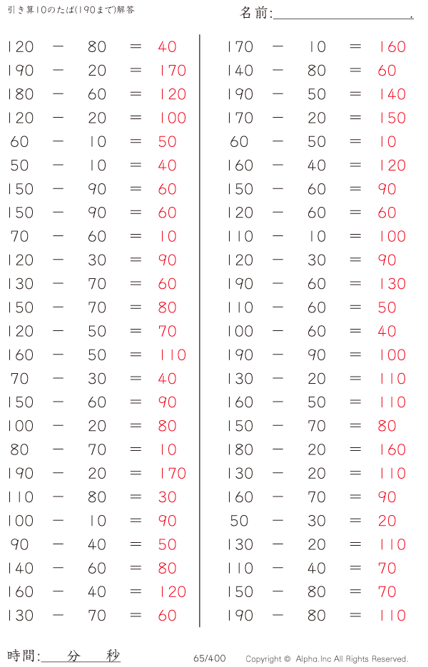 引き算10のたば(190まで) [解答]065/400