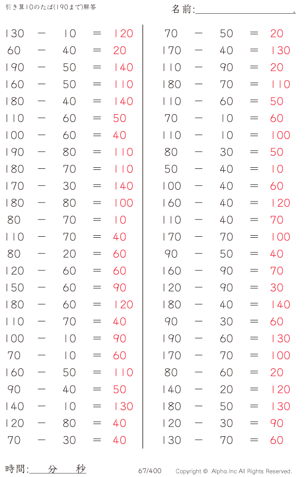 上記のボタンから「引き算10のたば(190まで)」の算数数学ドリル・計算ドリル(PDFプリント)がダウンロードできます。個人利用は無料です(家庭以外での配布は有料です)。