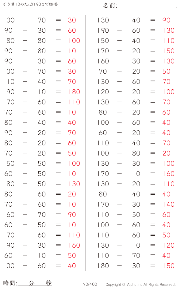 上記のボタンから「引き算10のたば(190まで)」の算数数学ドリル・計算ドリル(PDFプリント)がダウンロードできます。個人利用は無料です(家庭以外での配布は有料です)。