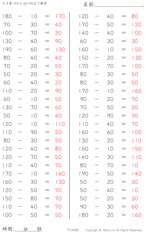 上記のボタンから「引き算10のたば(190まで)」の算数数学ドリル・計算ドリル(PDFプリント)がダウンロードできます。個人利用は無料です(家庭以外での配布は有料です)。