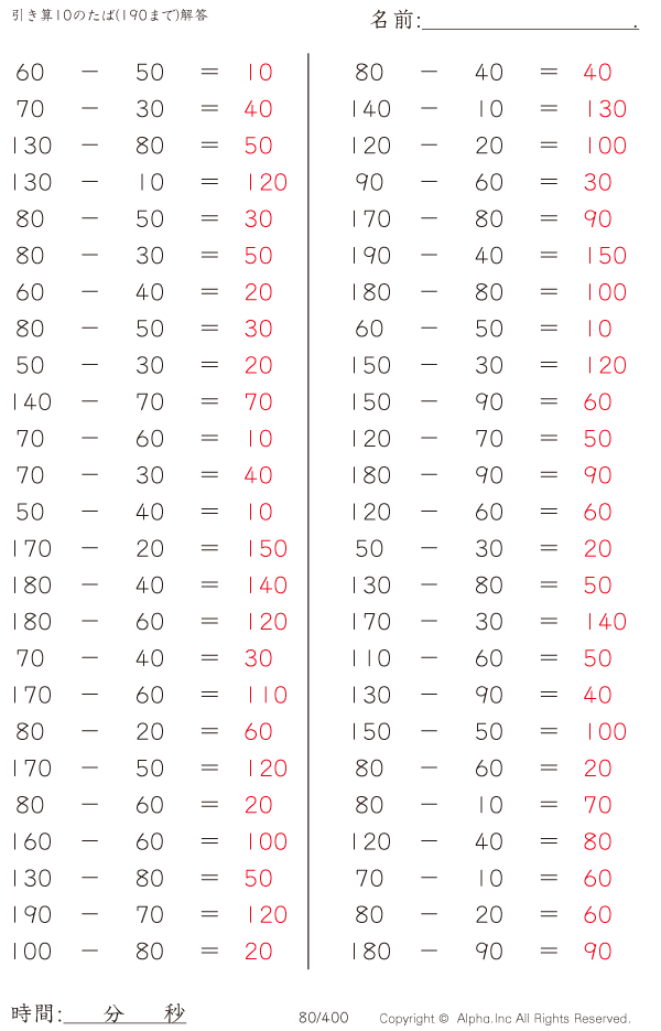 上記のボタンから「引き算10のたば(190まで)」の算数数学ドリル・計算ドリル(PDFプリント)がダウンロードできます。個人利用は無料です(家庭以外での配布は有料です)。