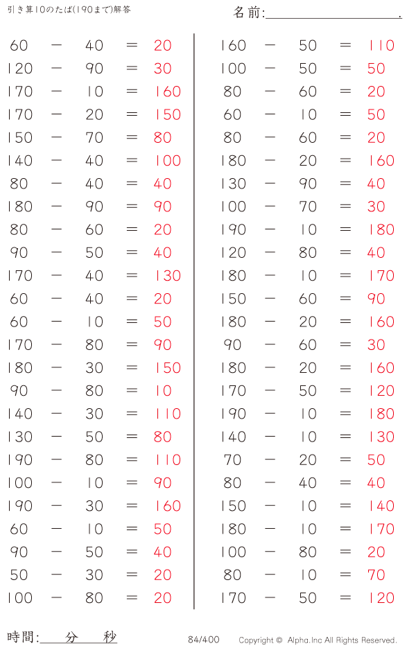 引き算10のたば(190まで) [解答]084/400