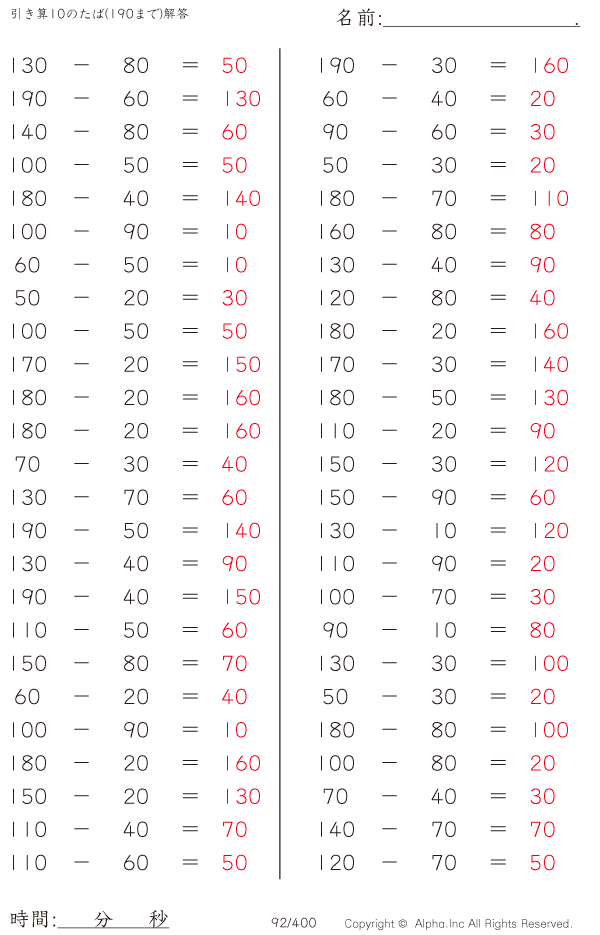 上記のボタンから「引き算10のたば(190まで)」の算数数学ドリル・計算ドリル(PDFプリント)がダウンロードできます。個人利用は無料です(家庭以外での配布は有料です)。