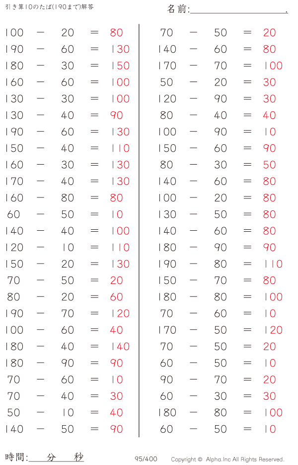 上記のボタンから「引き算10のたば(190まで)」の算数数学ドリル・計算ドリル(PDFプリント)がダウンロードできます。個人利用は無料です(家庭以外での配布は有料です)。