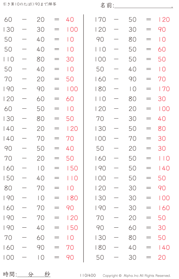 上記のボタンから「引き算10のたば(190まで)」の算数数学ドリル・計算ドリル(PDFプリント)がダウンロードできます。個人利用は無料です(家庭以外での配布は有料です)。