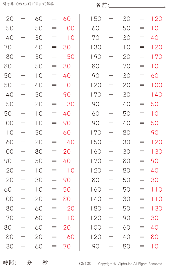 上記のボタンから「引き算10のたば(190まで)」の算数数学ドリル・計算ドリル(PDFプリント)がダウンロードできます。個人利用は無料です(家庭以外での配布は有料です)。