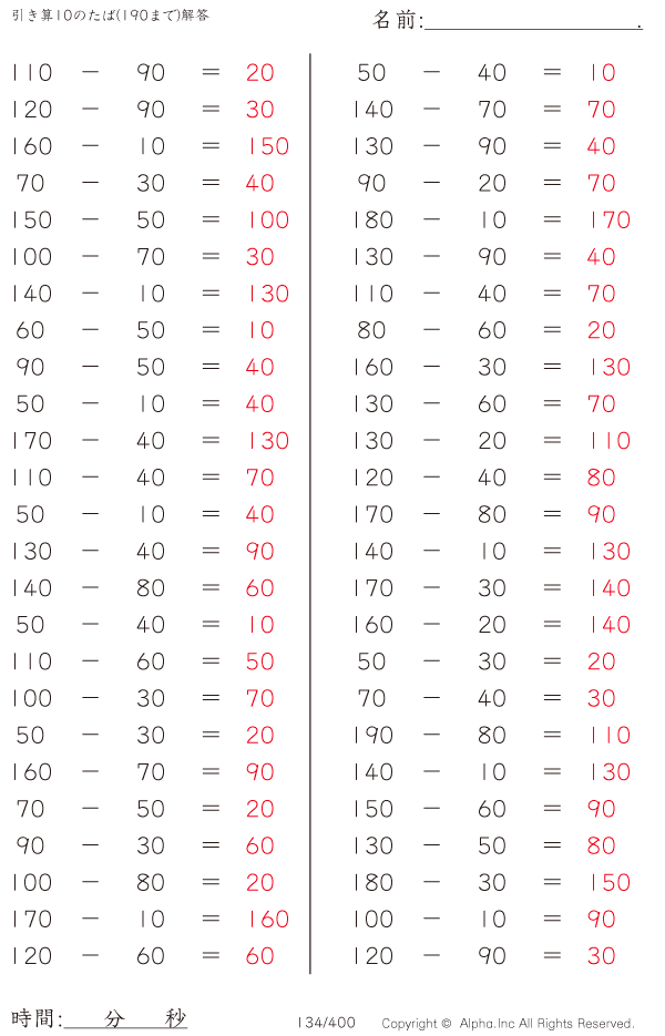 上記のボタンから「引き算10のたば(190まで)」の算数数学ドリル・計算ドリル(PDFプリント)がダウンロードできます。個人利用は無料です(家庭以外での配布は有料です)。