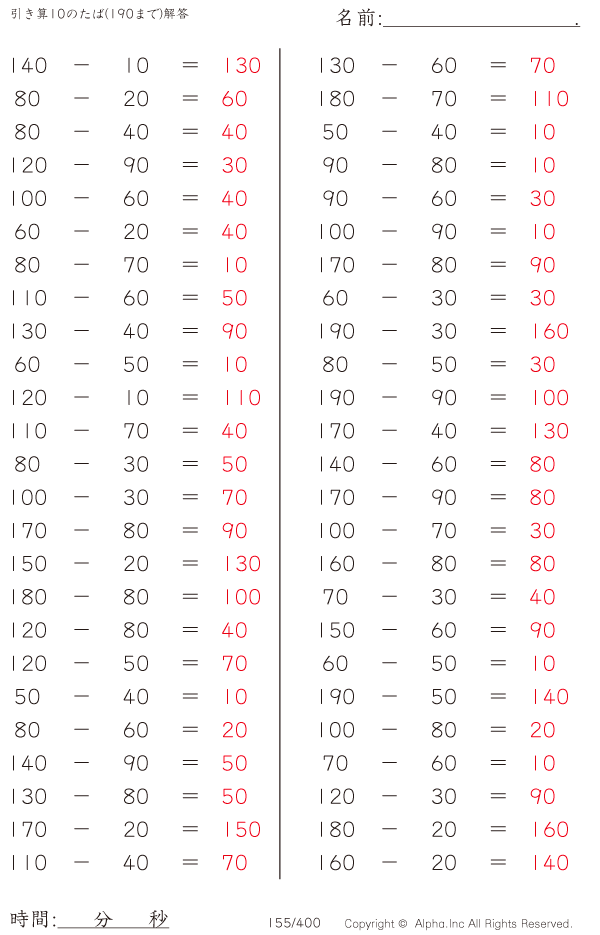 上記のボタンから「引き算10のたば(190まで)」の算数数学ドリル・計算ドリル(PDFプリント)がダウンロードできます。個人利用は無料です(家庭以外での配布は有料です)。