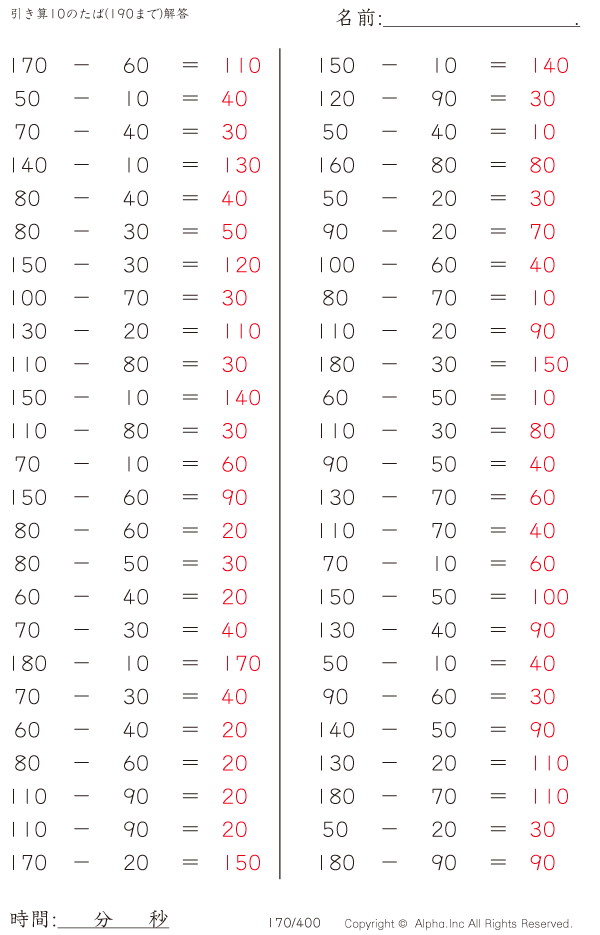上記のボタンから「引き算10のたば(190まで)」の算数数学ドリル・計算ドリル(PDFプリント)がダウンロードできます。個人利用は無料です(家庭以外での配布は有料です)。