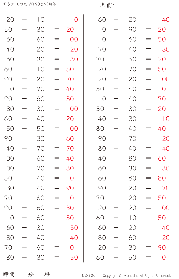 上記のボタンから「引き算10のたば(190まで)」の算数数学ドリル・計算ドリル(PDFプリント)がダウンロードできます。個人利用は無料です(家庭以外での配布は有料です)。