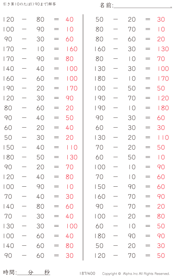 上記のボタンから「引き算10のたば(190まで)」の算数数学ドリル・計算ドリル(PDFプリント)がダウンロードできます。個人利用は無料です(家庭以外での配布は有料です)。