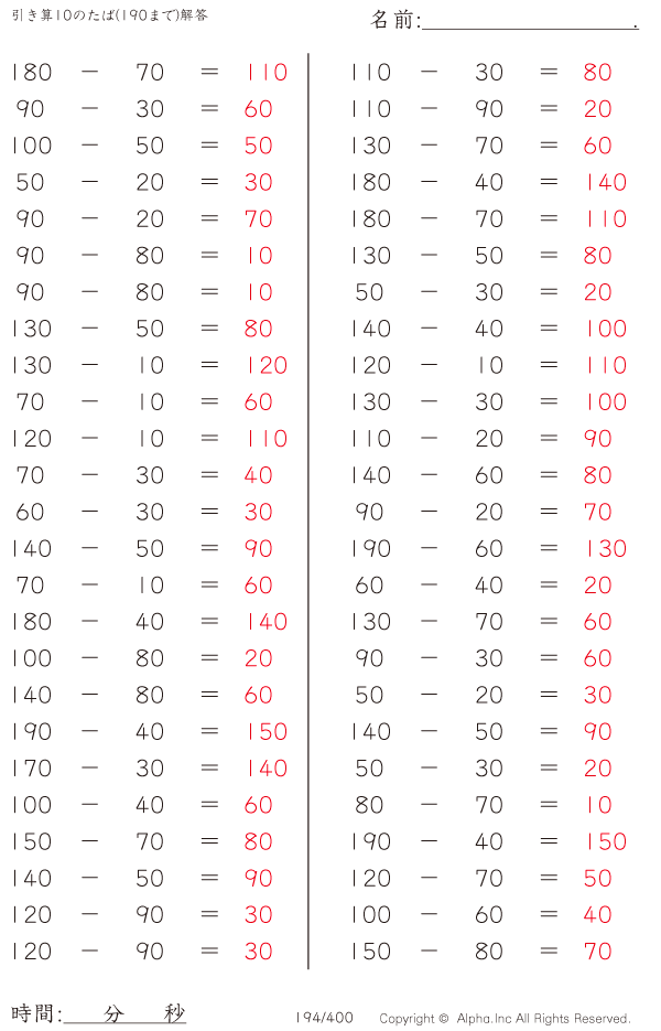 上記のボタンから「引き算10のたば(190まで)」の算数数学ドリル・計算ドリル(PDFプリント)がダウンロードできます。個人利用は無料です(家庭以外での配布は有料です)。