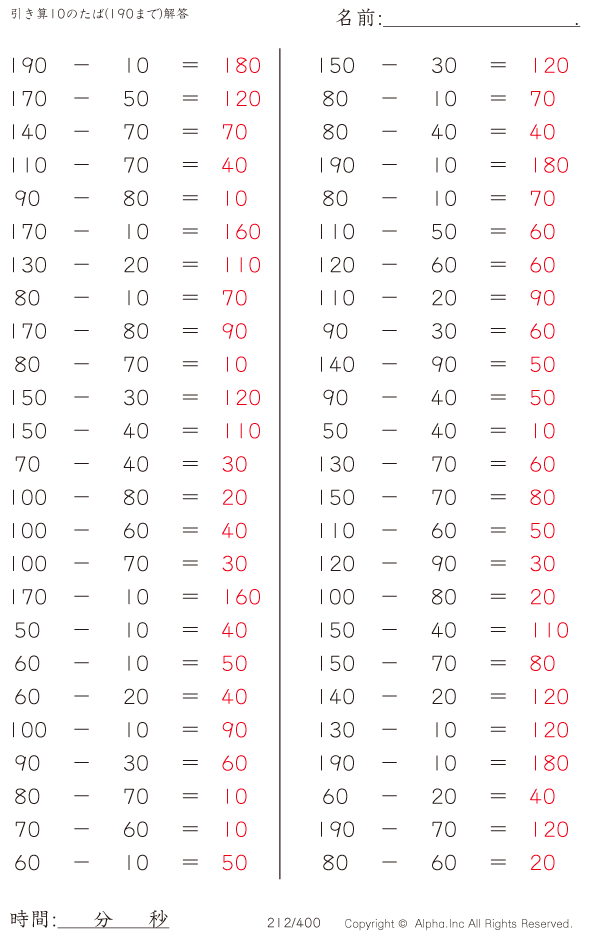 上記のボタンから「引き算10のたば(190まで)」の算数数学ドリル・計算ドリル(PDFプリント)がダウンロードできます。個人利用は無料です(家庭以外での配布は有料です)。