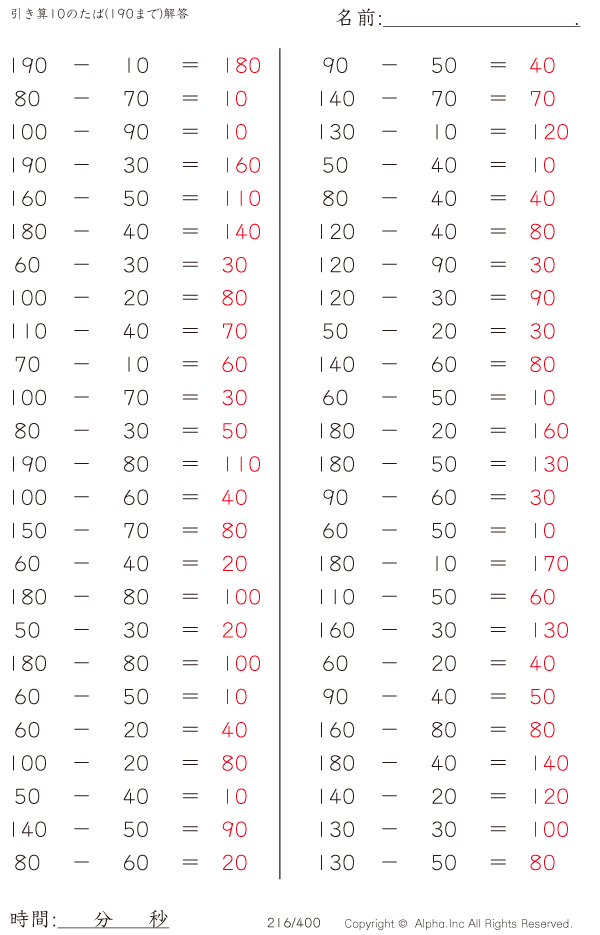上記のボタンから「引き算10のたば(190まで)」の算数数学ドリル・計算ドリル(PDFプリント)がダウンロードできます。個人利用は無料です(家庭以外での配布は有料です)。