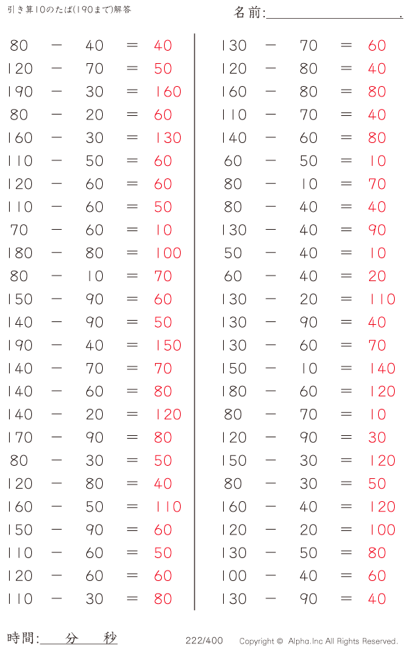 上記のボタンから「引き算10のたば(190まで)」の算数数学ドリル・計算ドリル(PDFプリント)がダウンロードできます。個人利用は無料です(家庭以外での配布は有料です)。