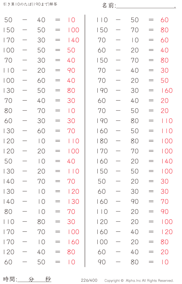 上記のボタンから「引き算10のたば(190まで)」の算数数学ドリル・計算ドリル(PDFプリント)がダウンロードできます。個人利用は無料です(家庭以外での配布は有料です)。