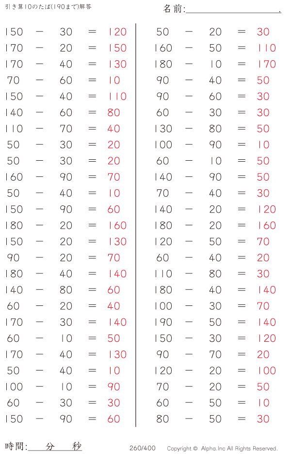 上記のボタンから「引き算10のたば(190まで)」の算数数学ドリル・計算ドリル(PDFプリント)がダウンロードできます。個人利用は無料です(家庭以外での配布は有料です)。