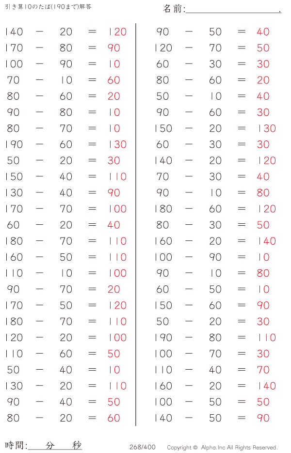 上記のボタンから「引き算10のたば(190まで)」の算数数学ドリル・計算ドリル(PDFプリント)がダウンロードできます。個人利用は無料です(家庭以外での配布は有料です)。
