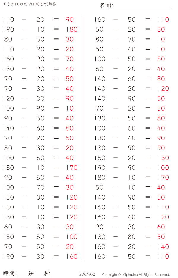 上記のボタンから「引き算10のたば(190まで)」の算数数学ドリル・計算ドリル(PDFプリント)がダウンロードできます。個人利用は無料です(家庭以外での配布は有料です)。
