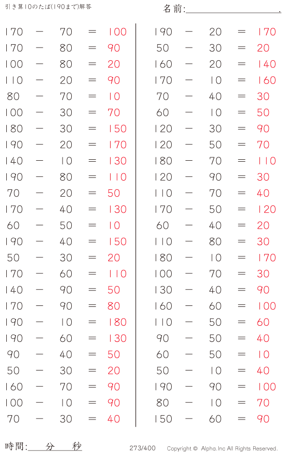 上記のボタンから「引き算10のたば(190まで)」の算数数学ドリル・計算ドリル(PDFプリント)がダウンロードできます。個人利用は無料です(家庭以外での配布は有料です)。