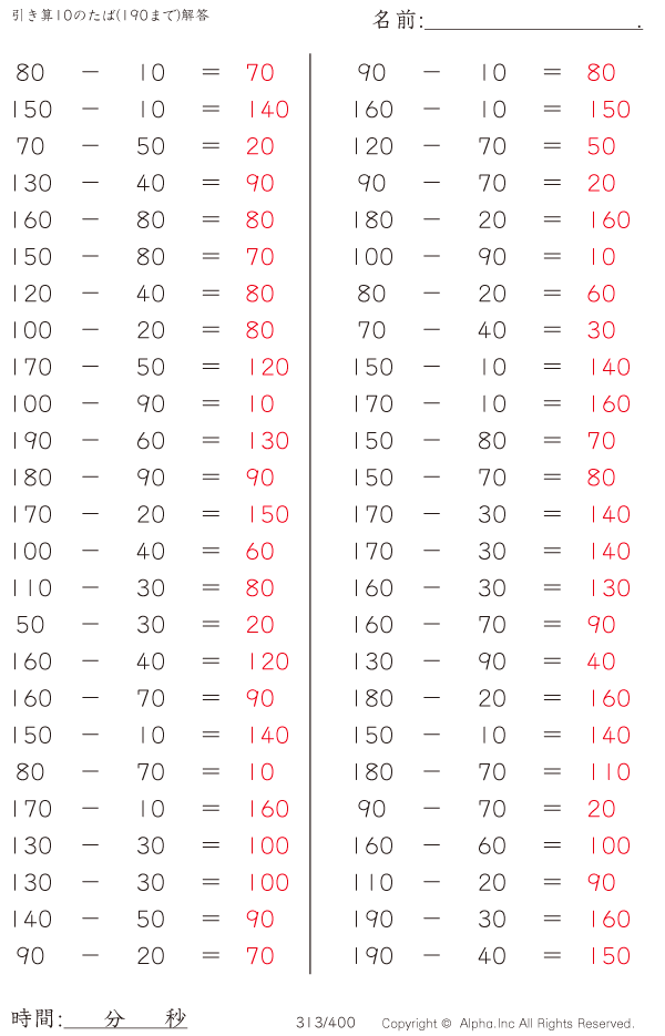 上記のボタンから「引き算10のたば(190まで)」の算数数学ドリル・計算ドリル(PDFプリント)がダウンロードできます。個人利用は無料です(家庭以外での配布は有料です)。