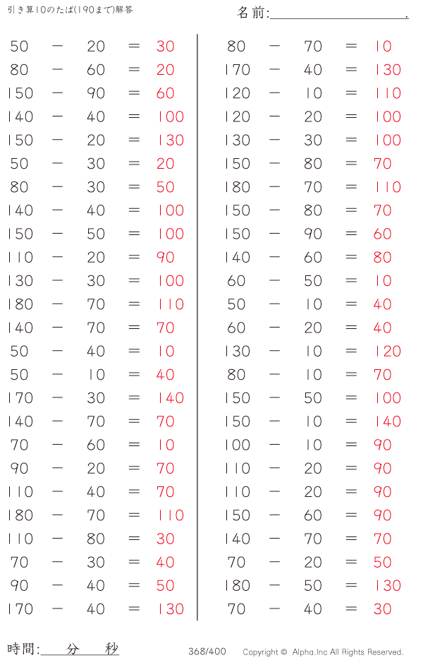 上記のボタンから「引き算10のたば(190まで)」の算数数学ドリル・計算ドリル(PDFプリント)がダウンロードできます。個人利用は無料です(家庭以外での配布は有料です)。