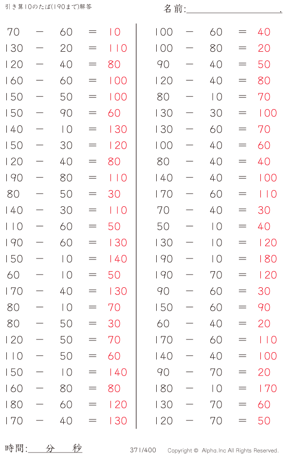 引き算10のたば(190まで)の問題解答ガイド