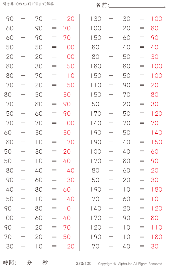上記のボタンから「引き算10のたば(190まで)」の算数数学ドリル・計算ドリル(PDFプリント)がダウンロードできます。個人利用は無料です(家庭以外での配布は有料です)。