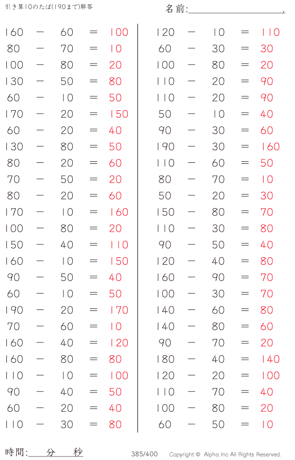 引き算10のたば(190まで)の問題解答ガイド