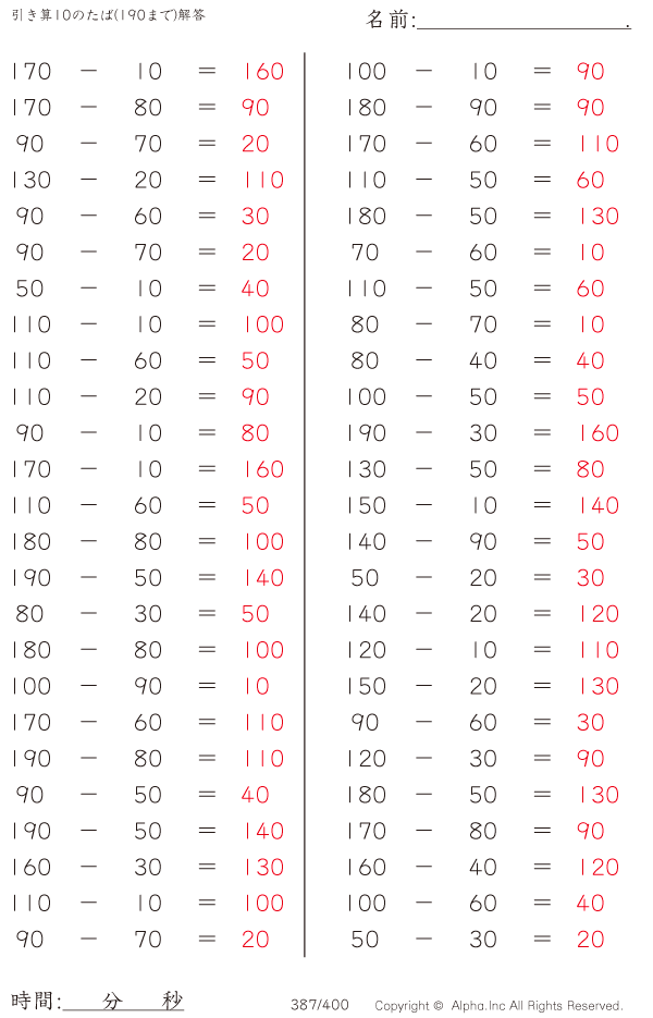 上記のボタンから「引き算10のたば(190まで)」の算数数学ドリル・計算ドリル(PDFプリント)がダウンロードできます。個人利用は無料です(家庭以外での配布は有料です)。