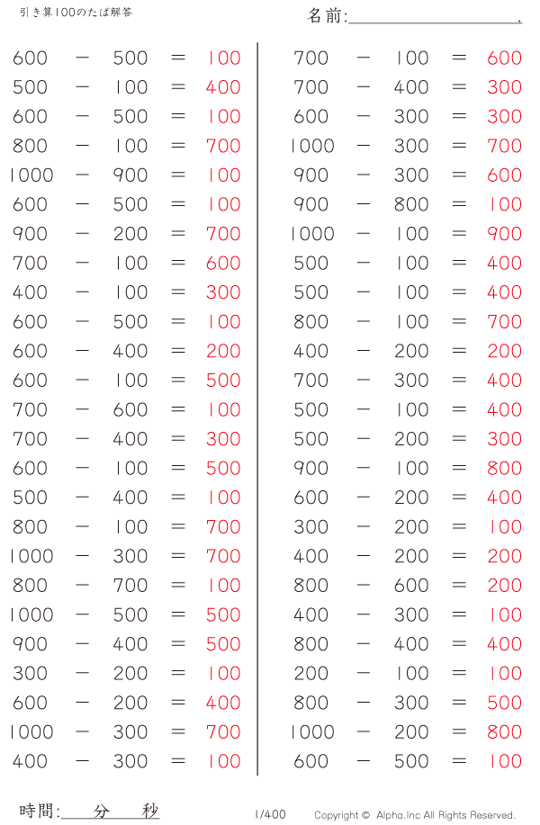 上記のボタンから「引き算100のたば」の算数数学ドリル・計算ドリル(PDFプリント)がダウンロードできます。個人利用は無料です(家庭以外での配布は有料です)。