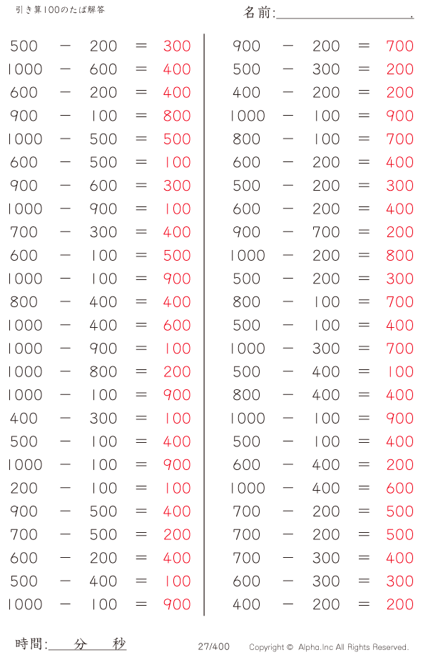 上記のボタンから「引き算100のたば」の算数数学ドリル・計算ドリル(PDFプリント)がダウンロードできます。個人利用は無料です(家庭以外での配布は有料です)。