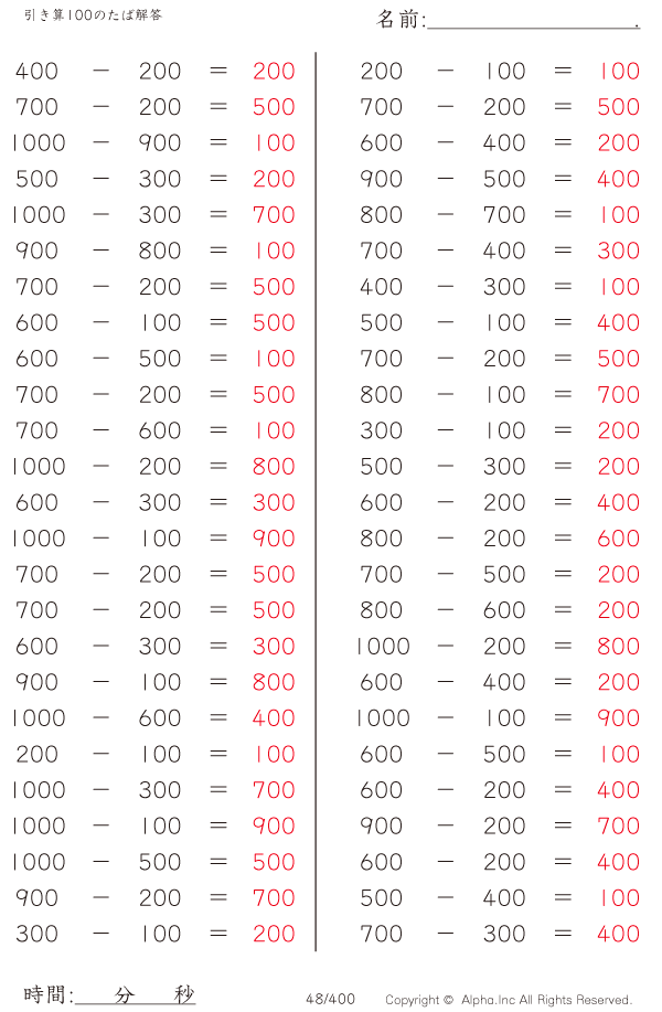 上記のボタンから「引き算100のたば」の算数数学ドリル・計算ドリル(PDFプリント)がダウンロードできます。個人利用は無料です(家庭以外での配布は有料です)。