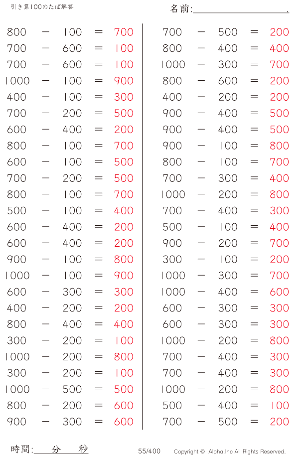 上記のボタンから「引き算100のたば」の算数数学ドリル・計算ドリル(PDFプリント)がダウンロードできます。個人利用は無料です(家庭以外での配布は有料です)。