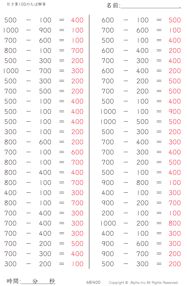 上記のボタンから「引き算100のたば」の算数数学ドリル・計算ドリル(PDFプリント)がダウンロードできます。個人利用は無料です(家庭以外での配布は有料です)。