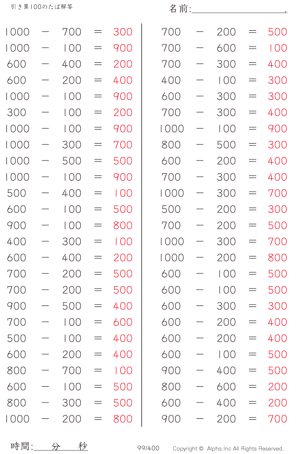 上記のボタンから「引き算100のたば」の算数数学ドリル・計算ドリル(PDFプリント)がダウンロードできます。個人利用は無料です(家庭以外での配布は有料です)。