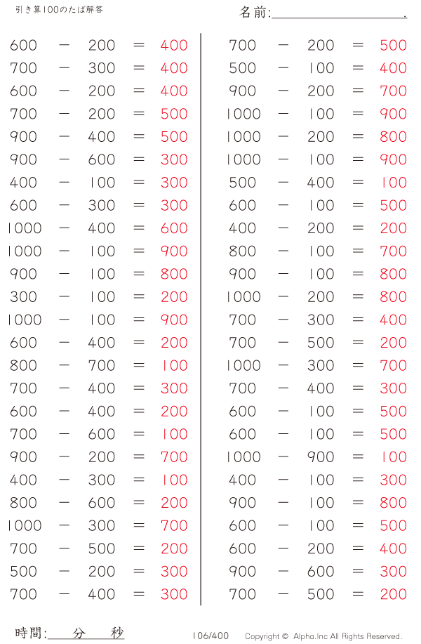 上記のボタンから「引き算100のたば」の算数数学ドリル・計算ドリル(PDFプリント)がダウンロードできます。個人利用は無料です(家庭以外での配布は有料です)。