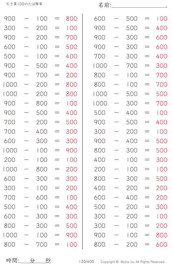 上記のボタンから「引き算100のたば」の算数数学ドリル・計算ドリル(PDFプリント)がダウンロードできます。個人利用は無料です(家庭以外での配布は有料です)。