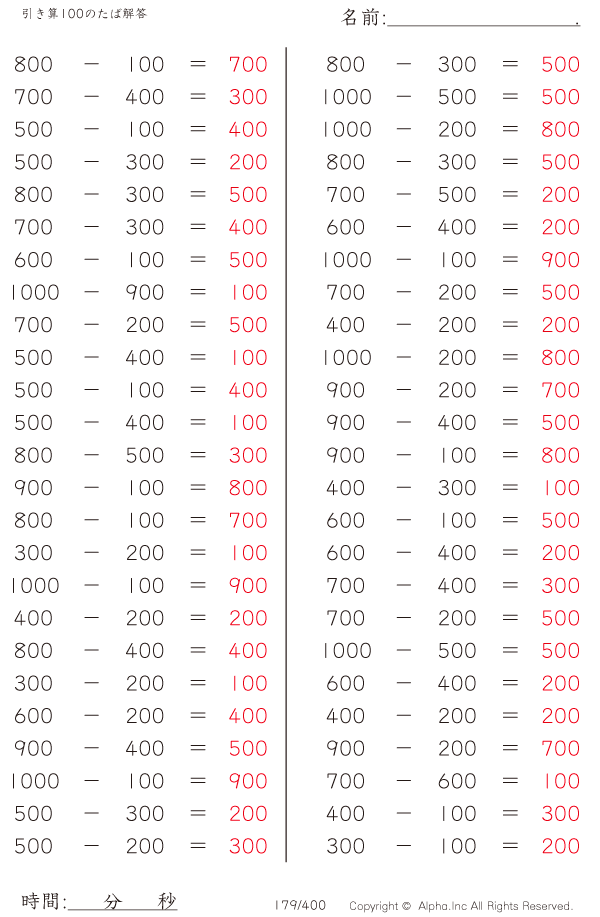 上記のボタンから「引き算100のたば」の算数数学ドリル・計算ドリル(PDFプリント)がダウンロードできます。個人利用は無料です(家庭以外での配布は有料です)。