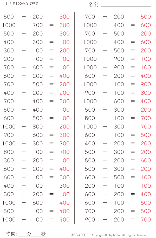 上記のボタンから「引き算100のたば」の算数数学ドリル・計算ドリル(PDFプリント)がダウンロードできます。個人利用は無料です(家庭以外での配布は有料です)。