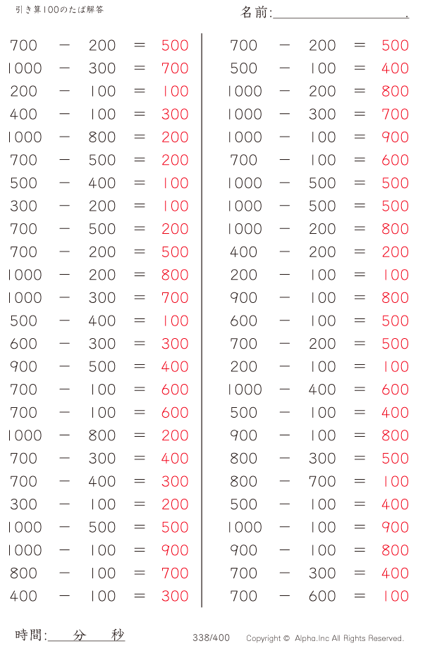 上記のボタンから「引き算100のたば」の算数数学ドリル・計算ドリル(PDFプリント)がダウンロードできます。個人利用は無料です(家庭以外での配布は有料です)。